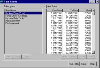 Rate Tables are the heart of the program. It is these pre-defined interest rate tables that allow the program to calculate the interest owing for each change in rate between any two dates. The program is supplied to you with the four tables used within the Court System of BC. The user may update, add or remove tables as necessary.